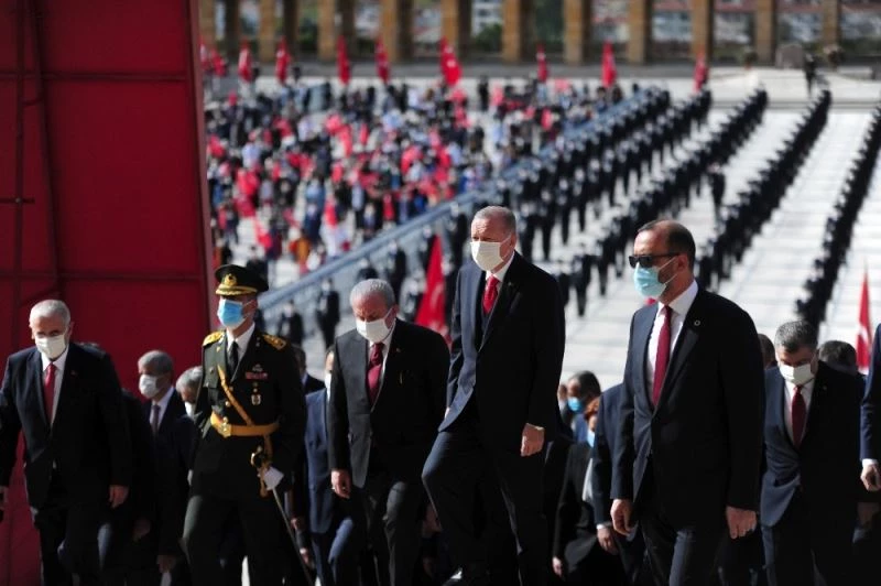 Cumhurbaşkanı Erdoğan, beraberinde TBMM Başkanı Mustafa Şentop, Cumhurbaşkanı Yardımcısı Fuat Oktay, CHP Genel Başkanı Kemal Kılıçdaroğlu, MHP Genel Başkanı Devlet Bahçeli, İYİ Parti Genel Başkanı Meral Akşener, Cumhurbaşkanlığı kabine üyeleri, yüksek yargı temsilcileri, siyasi parti temsilcileri, Genelkurmay Başkanı Orgeneral Yaşar Güler ve kuvvet komutanları ile birlikte Aslanlı Yol’dan yürüyerek Atatürk’ün mozolesine geldi. Mozoleye çelenk bırakılmasının ardından saygı duruşunda bulunuldu ve İstiklal Marşı okundu. Heyet, daha sonra Misak-ı Milli Kulesi’ne geçti. Anıtkabir Özel Defteri’ni imzalayan Erdoğan, deftere şunları yazdı: