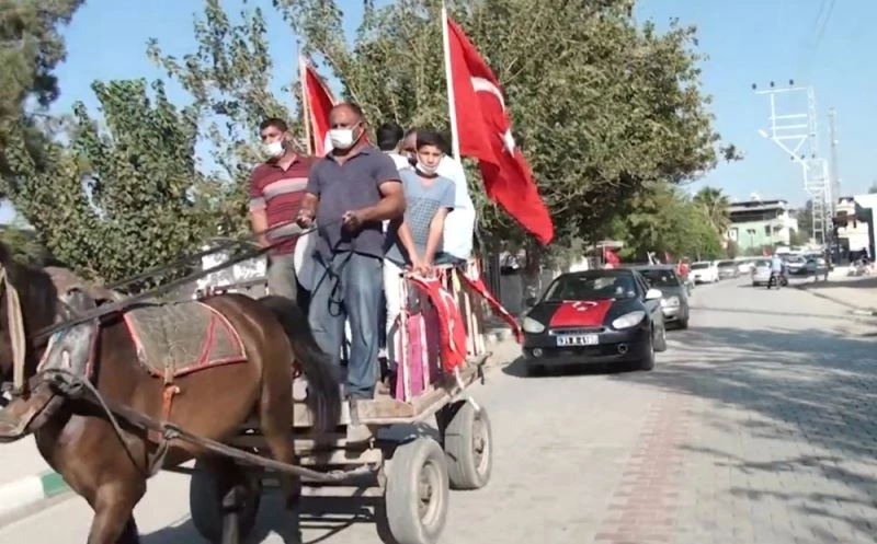 Cumhuriyet Bayramı tüm ülkede coşkuyla kutlanırken, Hatay’da alışılmışın dışında bir kutlama örneği geldi. Süslenen at arabası öncülüğünde gerçekleşen ’Bayrak Geçit Töreni’ davul zurna eşliğinde ilerledi.