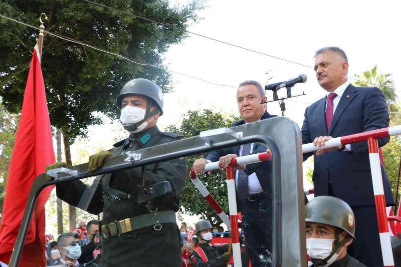 Tören açılışı, Vali Yazıcı ve Büyükşehir Belediye Başkanı Böcek’in askeri araca binip vatandaşları, öğrencileri ve gazileri selamlaması ile başladı. İstiklal Marşı’nın okunması ve saygı duruşunun ardından Cumhurbaşkanı Recep Tayyip Erdoğan’ın 29 Ekim Cumhuriyet Bayramı mesajı okundu. Alanda binlerce Türk Bayrağı dalgalandı.