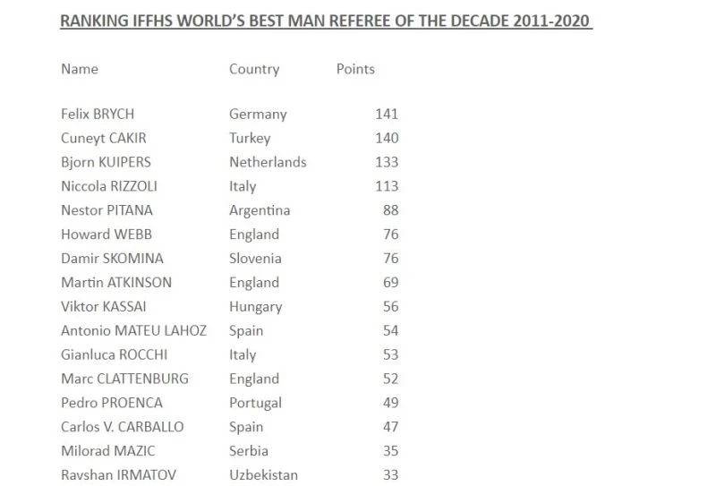 2011 ile 2020 yılları arasını kapsayan dönemde her yılın ilk 20 hakem listesi göz önüne alındı. Son 10 yılda en çok puanı toplayarak en başarılı hakem Felix Brych olurken, Alman hakem, 2016-17 sezonu UEFA Şampiyonlar Ligi finali başta olmak üzere, bir çok önemli müsabakada görev aldı. Felix Brych’in 141 puanla zirvede yer aldığı listede Cüneyt Çakır 140 puanla ikinci sırada yer aldı. 2014-2015 sezonunda UEFA Şampiyonlar Ligi finalinde görev yapan Çakır’ı, listede Hollandalı Bjorn Kuipers takip etti.