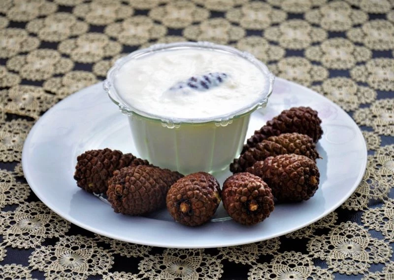 Son günlerde popüler hale gelen çam kozalağı, Hatice Çabuk isimli ev hanımının hünerli ellerinde yoğurda dönüşüyor.