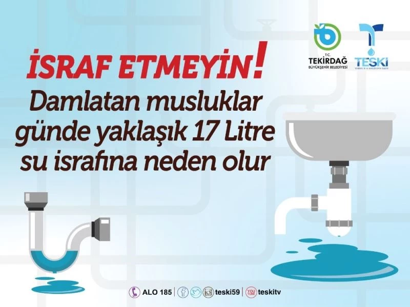 Tekirdağ Su ve Kanalizasyon İdaresince (TESKİ) içme suyuyla ilgili yapılan uyarıda, “Damlatan musluk günde 17 litre su israfına neden olur” ifadelerine yer verildi.