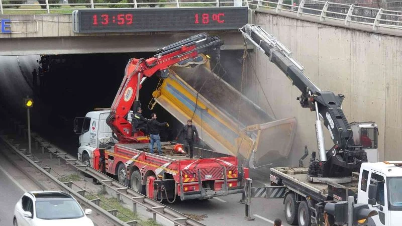 Trabzon’un Ortahisar ilçesinde dalçıktan geçerken damperi geçidin tavanına takılan kamyon az kalsın faciaya neden oluyordu. Kazada ölen ya da yaralanan olmazken kamyonun damperi uzun uğraşlar sonucu çekici yardımıyla bulunduğu yerden çıkartıldı.