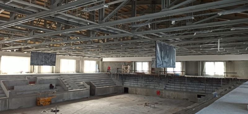Dış cephesi tamamen şekillenen yapının, sıva imalatları da tamamlandı. Alçıpan asma tavan imalatlarına devam eden ekipler, cam montajına da başladı. Tribün kat basamakları betonu dökülen spor salonunun, baffle asma tavan için iskele kurulumu ve geniş alanların daha homojen iklimlendirilmesine imkan tanıyacak ‘roofto’ etrafındaki çatıya başlandı. Mermer basamak döşemesi tamamlanırken zemin katta seramik döşenmesine devam ediliyor.