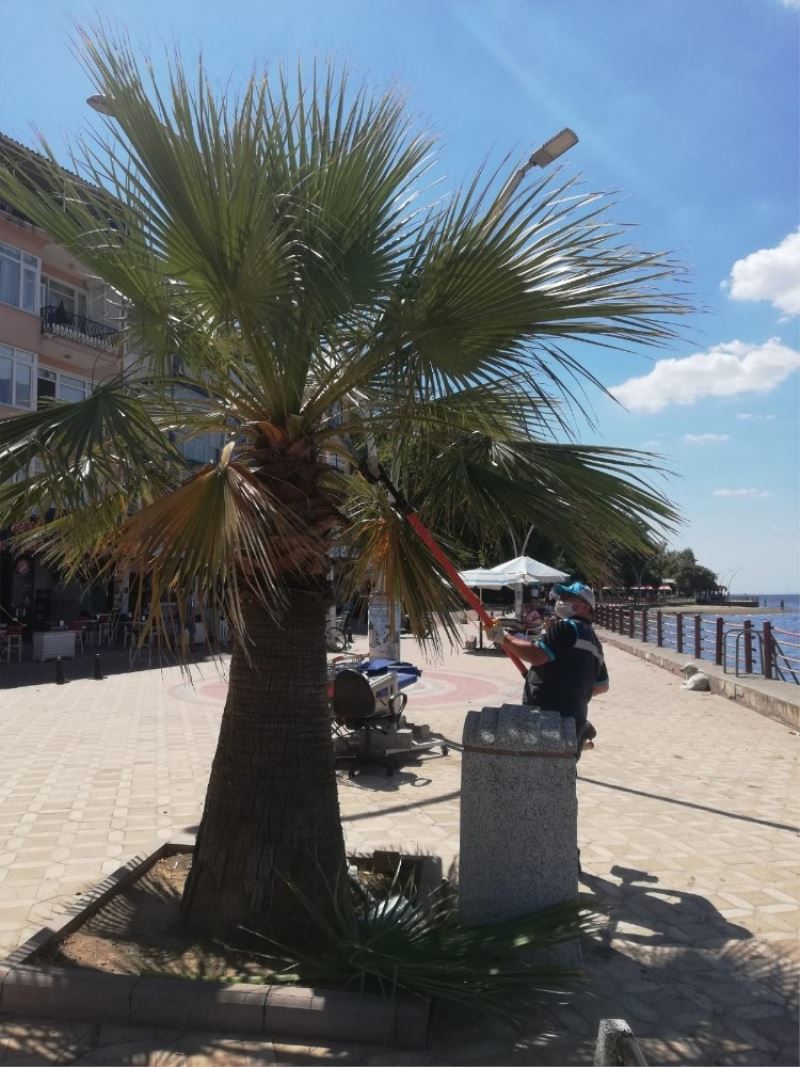 Bu kapsamda yoğun bir çalışma ortaya koyan Park ve Bahçeler Daire Başkanlığı ekipleri, sahile farklı bir güzellik katan palmiyelerin vinç yardımı ile budaması yapıldı. Budamadan dolayı ortaya çıkan dallar ise çevreye zarar vermeden taşındı.