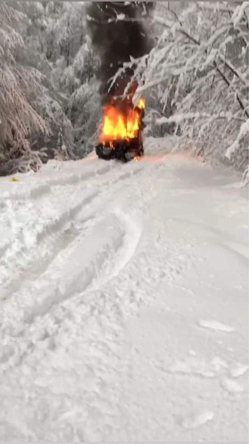 Yalova’da Delmece Yaylası’na karlı havada çıkmaya çalışan cipte çıkan yangın sonrasında araç alev alev yanarak kül oldu.