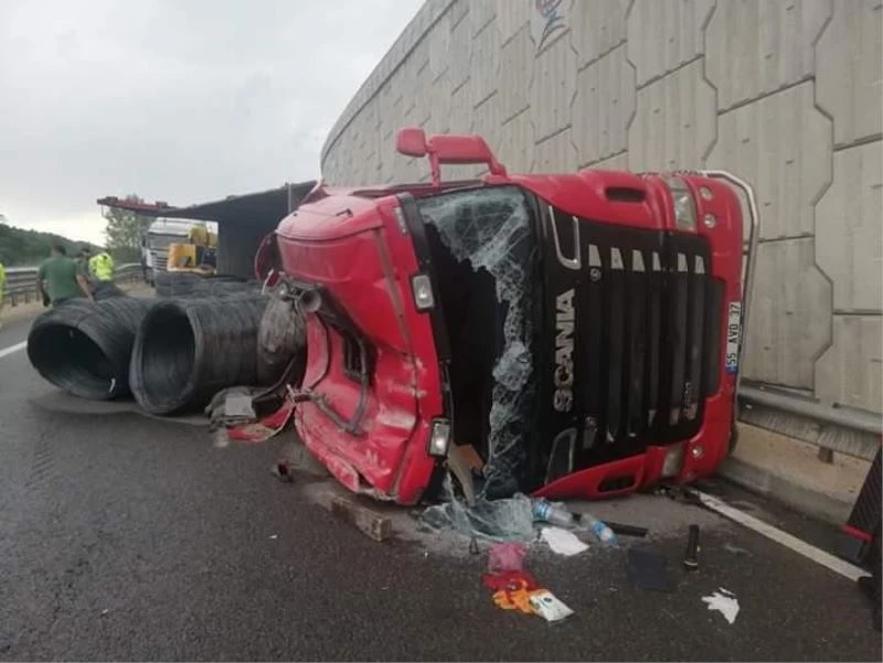 Karabük’te demir yüklü tır yağışlı hava nedeniyle kontrolden çıkan tır şarampole devrilerek yan yattı, sürücü yaralandı.