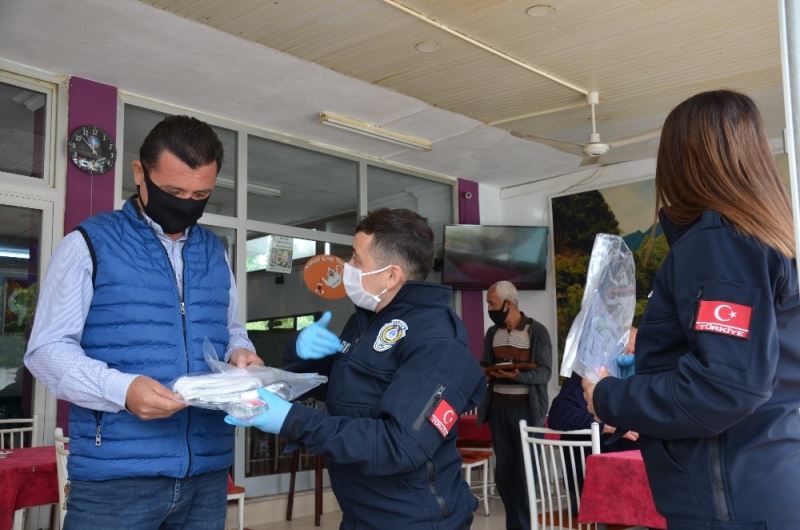 Manisa’nın Demirci ilçesinde 80 gün sonra faaliyetlerine başlayan kahvehanelere içinde dezenfektanın da yer aldığı hijyen seti hediye edildi.