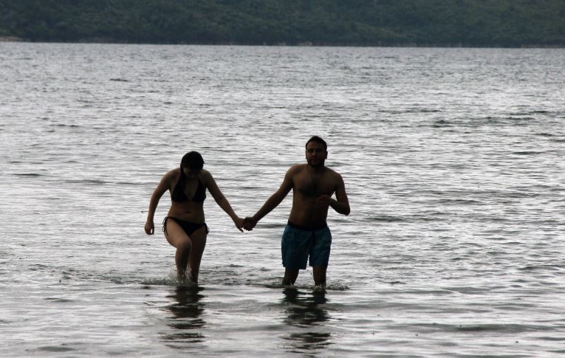 Cumhurbaşkanı Recep Tayyip Erdoğan’ın yeni normalleşme kararları kapsamında plajların tekrar halkın hizmetine acıması sonrası Muğla’da yağışlı havaya rağmen bir grup genç deniz hasretini Akyaka sahilinde denize girerek giderdi.