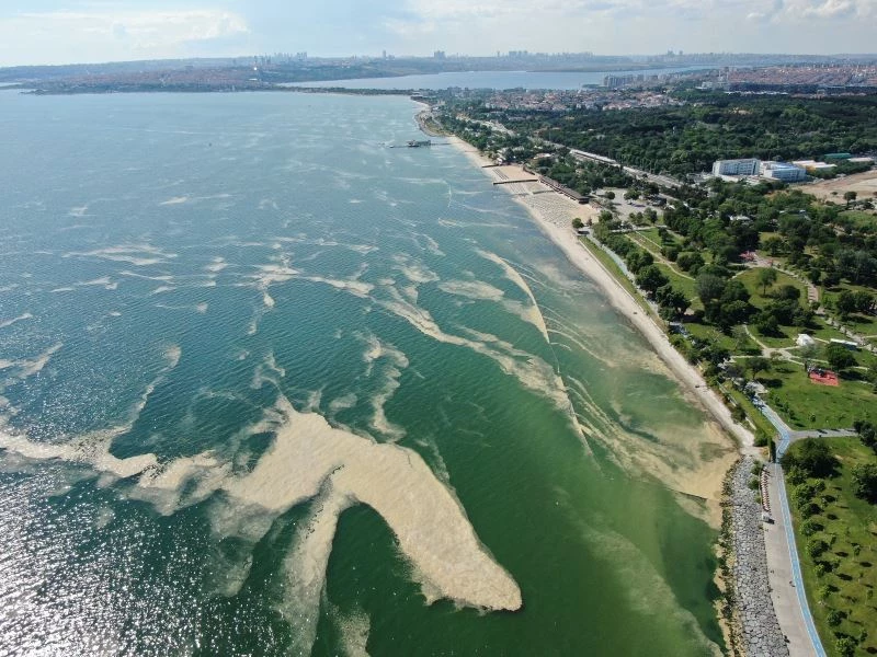 Marmara Denizini etkisi altına alan deniz salyası olarak bilinen müsilaj bu kez Bakırköy kıyılarını sardı. Sahilde deniz salyası ile oluşan tabaka, drone ile görüntülendi.