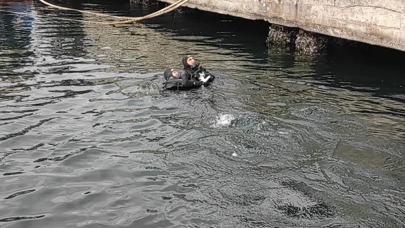 Bir ihbarı değerlendiren Bursa Emniyet Müdürlüğü Deniz Liman Şube Müdürlüğü su altı ekipleri, Gemlik Liman bölgesinde 3 gündür mahsur kalan kediyi kurtarmak için seferber oldu.