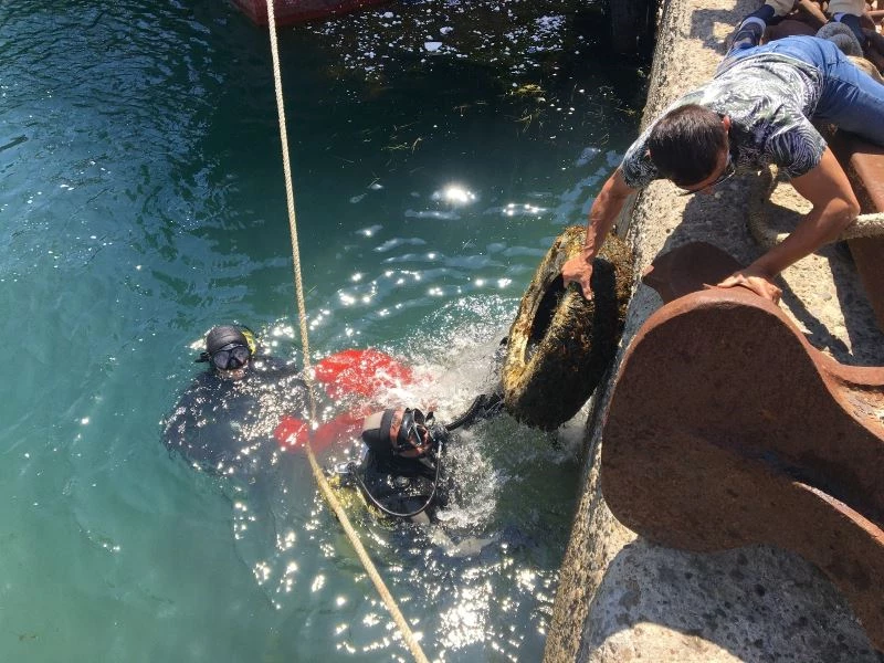 Ellerindeki file çuvallarla denize dalan dalgıç ekipleri 2 saat süren çalışma sonunda çok sayıda araç lastiğini karaya çıkarırken pet şişeler, cam şişeler, ağ parçaları, konserve kutularından oluşan yaklaşık 20 çuval atık topladılar.