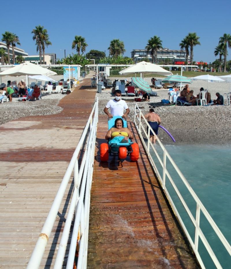 Antalya Büyükşehir Belediyesi’nin engelli bireyleri denizle buluşturan Konyaaltı ve Lara’daki Engelsiz Plajları şehir içi ve dışından gelen engelli tatilcilere serinleme imkanı sunuyor.