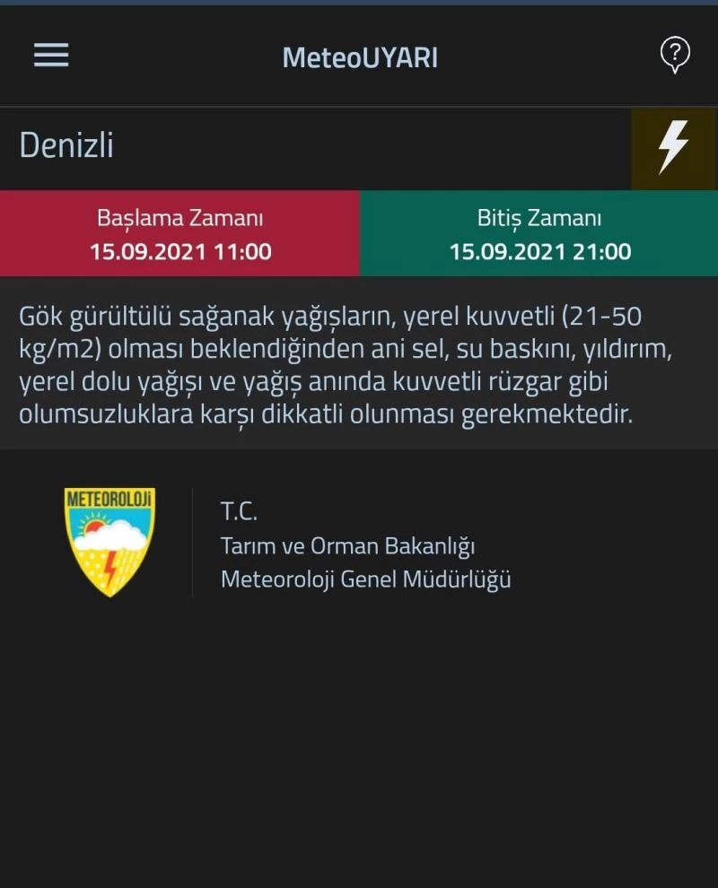Meteoroloji Genel Müdürlüğü tarafından yapılan açıklamada “Denizli’de yarın 11.00 ila 21. 00 saatleri arasında etkili olacağı tahmin edilen gök gürültülü sağanak yağışların, metrekareye 21- 50 kilogram yağış olması beklendiğinden ani sel, su baskını, yıldırım, yerel dolu yağışı ve yağış anında kuvvetli rüzgar gibi olumsuzluklara karşı dikkatli olunması gerekmektedir” ifadelerini yer aldı.