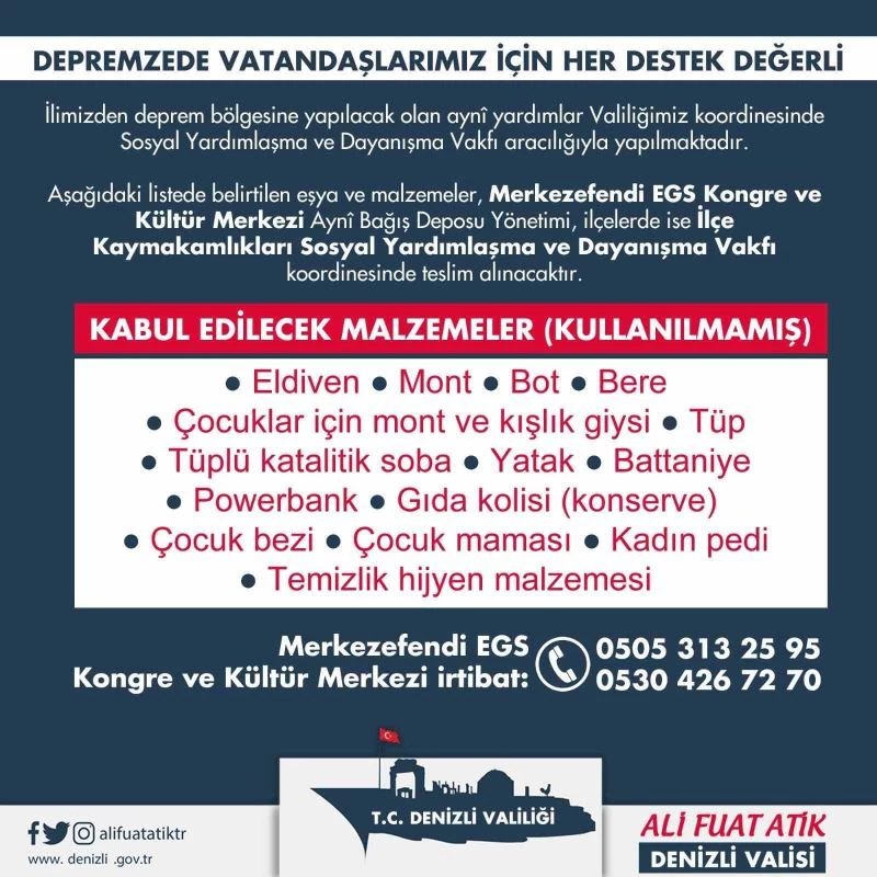 Denizli Valiliği tarafından yayımlanan açıklamada: “İlimizden deprem bölgesine yapılacak olan aynî yardımlar Valiliğimiz koordinesinde Sosyal Yardımlaşma ve Dayanışma Vakfı aracılığıyla yapılmaktadır. Aşağıdaki listede belirtilen eşya ve malzemeler, Merkezefendi EGS Kongre ve Kültür Merkezi Aynî Bağış Deposu Yönetimi, ilçelerde ise İlçe Kaymakamlıkları Sosyal Yardımlaşma ve Dayanışma Vakfı koordinesinde teslim alınacaktır.”