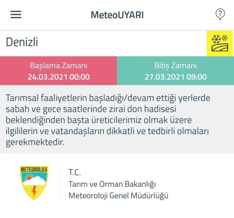 Meteoroloji Genel Müdürlüğü Denizli için zirai don uyarısında bulundu.