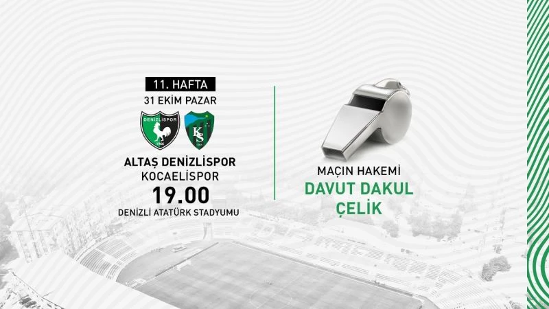 TFF 1. Lig’in 11. haftasında Altaş Denizlispor ile Kocaelispor arasında 31 Ekim Pazar günü oynanacak karşılaşmayı hakem Davut Dakul Çelik yönetecek.