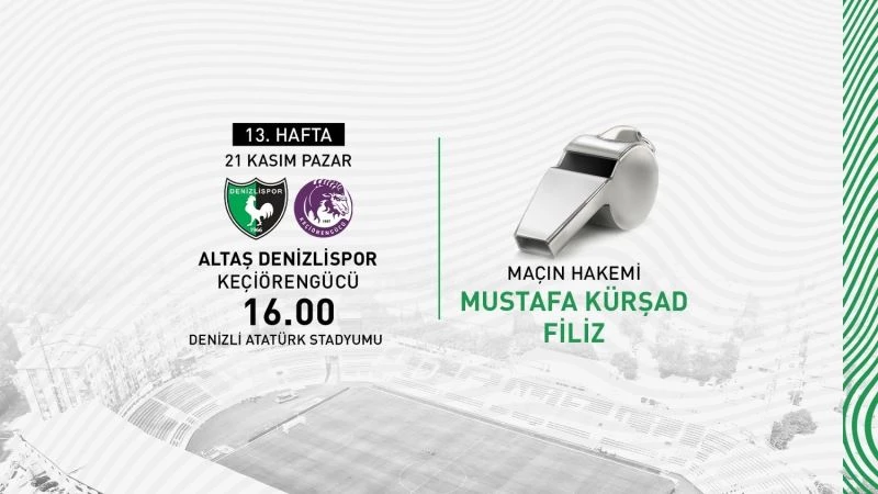 Spor Toto 1. Lig 2021-2022 sezonu 13. haftasında oynanacak karşılaşmalarda görev alacak hakemler belli oldu. Türkiye Futbol Federasyonu Merkez Hakem Kurulu tarafından yapılan açıklamaya göre, A. Denizlispor ile Keçiörengücü arasında oynanacak karşılaşmayı hakem Mustafa Kürşad Filiz yönetecek. Filiz’in yardımcılıklarını Mehmet Yıldırım ve Ferdi Karadoruk yapacak. Müsabakada dördüncü hakem olarak ise Can Cengiz görevlendirildi. Denizli Atatürk Stadyumu’nda oynanacak olan karşılaşma 21 Kasım Pazar günü saat 16.00’da başlayacak.