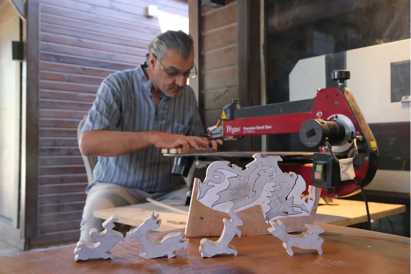 Grafik tasarım işiyle uğraşırken 2009'da tanıştığı ahşap işleme sanatında zamanla ustalaşan 55 yaşındaki Demirel, yapbozlarını profesyonel ortamda yapmak için Antakya ilçesi Maşuklu Mahallesi'nde atölye kurdu.