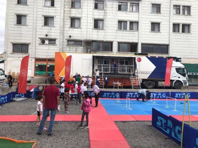 Muş Afet ve Acil Durum Müdürlüğü (AFAD) koordinasyonunda ’gezici deprem simülasyon eğitim tırı’ Malazgirt Zaferi’nin 949. yılı kutlama alanında yerini aldı.
