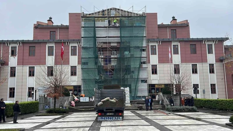 Düzce’de 23 Kasım’da meydana gelen 5,9 büyüklüğündeki depremde dış cephesi hasar gören adliye binasında onarım işlemleri sürüyor.