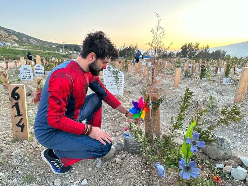 Adana’da faaliyet gösteren bir derneğin üyeleri, Hatay’da depremde hayatını kaybeden çocukların mezarına süper kahraman kostümleri giyerek rüzgar gülü bıraktı.