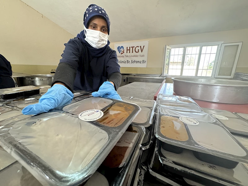 Hollanda Türk Gönüllüler Vakfınca Hatay'ın Kırıkhan ilçesine kurulan aşevinde depremzede kadınların hazırladığı günlük 3 çeşit yemek, ihtiyaç sahibi afetzedenin iftar sofrasına ulaştırılıyor.