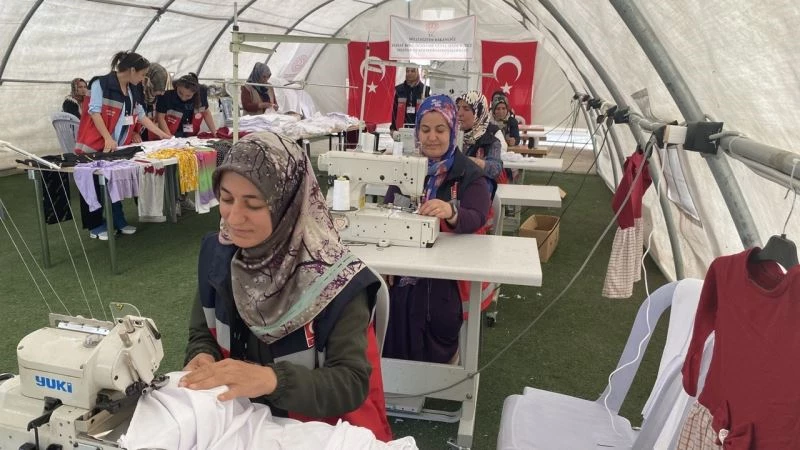 Milli Eğitim Bakanlığının ödenekleri ve hayırsever tekstil firmalarından alınan malzemelerle Adıyaman Halk Eğitim Merkezi bünyesinde açılan kurslarda görev alan usta öğreticiler ve öğrenciler tarafından depremden etkilenen vatandaşlar için Adıyaman merkezde 4, Gölbaşı ilçesinde 1 olmak üzere toplam 5 çadırda üretimler yapılıyor.