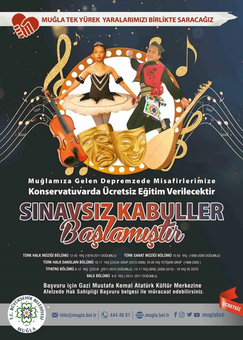 Depremzedelerin sanat eğitimi almaları için konsertavur bölümüne sınavsız alım yapacak olan Muğla Büyükşehir Belediyesi birçok farklı alanda eğitim verecek. Belirlenen kriterler gereği 12-45 yaş arası Türk Halk Müziği, 15-55 yaş arası Türk Sanat Müziği, 10-17 yaş çocuk 18-35 yaş grupları yetişkin Türk Halk Dansları, 8-12 yaş çocuk, 13-17 yaş genç 18 yaş üstü yetişkin Tiyatro Bölümü ve 6-9 yaş bale bölümüne başvurabilecek. Başvurular Gazi Mustafa Kemal Atatürk Kültür Merkezine yapılabilecek. Ayrıca Deprem bölgesinden gelen misafirlerin çamaşır yıkama ve kurutma konusunda da destek sağlayan Büyükşehir Belediyesi Türkan Saylan Çağdaş Yaşam Merkezi içerisinde bu hizmeti de ücretsiz olarak hayata geçirdi.