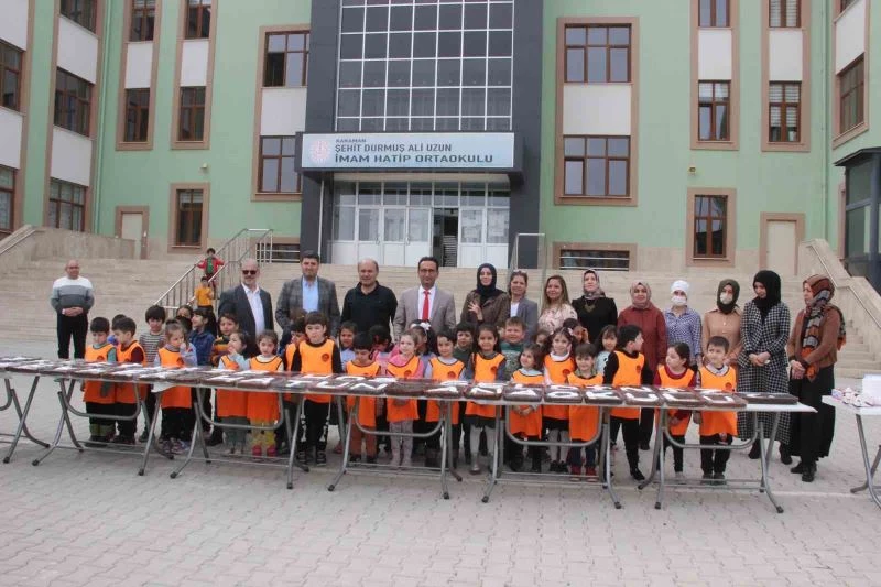 Karaman Gevher Hatun Anaokulu öğrencileri, anneleri ile birlikte evlerinde yaptıkları yaş pastaları ilk ve ortaokul olmak üzere 500’e yakın depremzede öğrencinin eğitim gördüğü Şehit Durmuş Ali Uzun İmam Hatip Ortaokuluna götürdü. Burada pastalar bahçeye konan masalarda birleştirilerek üzerine ‘şehrimize hoş geldiniz’ yazısı yazıldı. Daha sonra hazırlanan pasta anaokulu öğretmenleri tarafından teneffüse çıkan depremzede öğrencilere ikram edildi. Öğrenciler aldıkları pastayı afiyetle yedi.