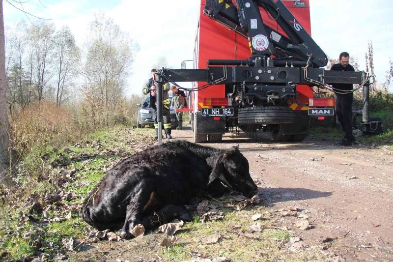 Kocaeli’de dereye düşen 6 aylık buzağı, itfaiye ekiplerinin müdahalesiyle kurtarıldı.