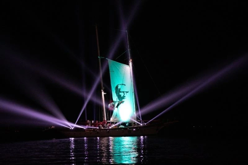 Muğla’nın Bodrum ilçesinden denize açılan dev gemi üzerinden Mustafa Kemal Atatürk’ün posteri bulunan gemi görsel şölen sundu.