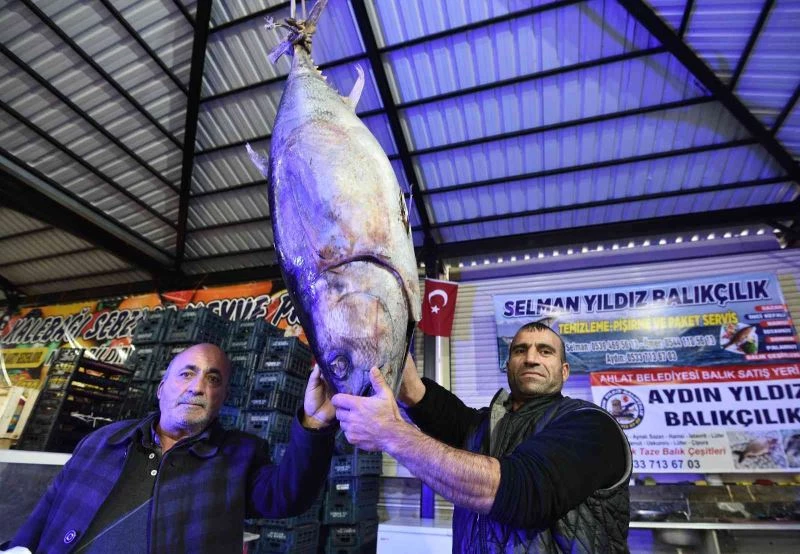 Bitlis’in Ahlat ilçesinde balıkçı tezgahında bulunan yaklaşık 50 kilo ağırlığındaki 1,5 metre uzunluğundaki orkinos vatandaşın ilgi odağı oldu.