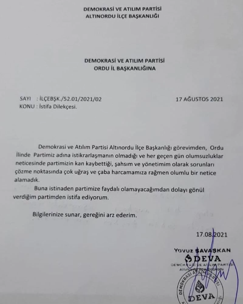 DEVA Partisi’nde Altınordu İlçe Başkanı Yavuz Savaşkan istifa etti. Yavuz Savaşkan, istifa dilekçesinde “Demokrasi ve Atılım Partisi Altınordu İlçe Başkanlığı görevinden, Ordu ilinde partimiz adına istikrarlaşmanın olmadığı ve her geçen gün olumsuzluklar neticesinde partimizin kan kaybettiği, şahsım ve yönetim olarak sorunları çözme noktasında çok uğraş ve çaba harcamamıza rağmen olumlu bir netice alamadık. Buna istinaden partimize faydalı olamayacağımdan dolayı gönül verdiğim partimden istifa ediyorum” dedi.