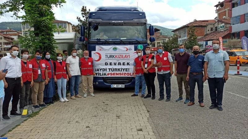 Geçtiğimiz günlerde Batı Karadeniz Bölgesinde etkili olan yoğun yağışlar nedeniyle sel felaketine maruz kalan bölge halkına Devrek’ten bir tır dolusu yardım malzemesi ile 30 bin lira nakdi yardım gönderildi. Zonguldak Valiliği koordinesinde hayata geçirilen ve Devrek Kaymakamlığı, Kızılay Devrek Temsilciliği ile sivil toplum kuruluş temsilciliklerinin ortaklaşa organize edilen program Cumhuriyet Alanında gerçekleştirildi.