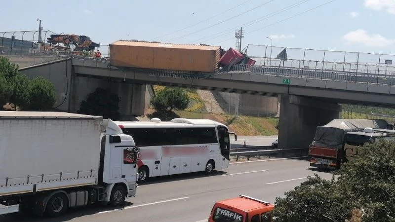Devrilen tır TEM Otoyolu üzerindeki köprüde aslı kaldı
