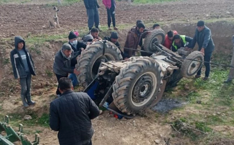Şanlıurfa’nın Birecik ilçesinde fıstık bahçesini süren sürücü, devrilen traktörün altında kalmaktan son anda kurtuldu.