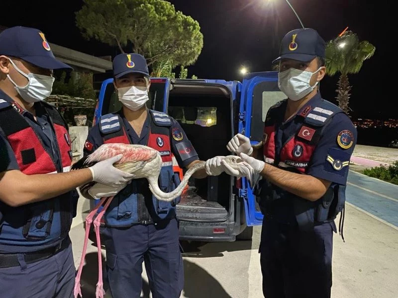 İzmir’in Aliağa ilçesinde devriye gezen jandarma ekiplerinin bulduğu yaralı flamingo koruma altına alındı.