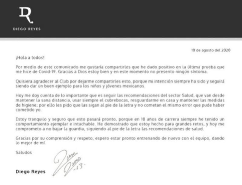 Fenerbahçe’de 2018-2019 sezonunda forma giyen Meksikalı futbolcu Diego Reyes, sosyal medyadan yaptığı paylaşımda korona virüs testinin pozitif çıktığını açıkladı. Şu anda sağlık durumunun iyi olduğunu belirten Reyes, "Sağlık çalışanlarının tavsiyelerine uyun. Benim yaptığım hatayı yapmayın" ifadelerini kullandı.