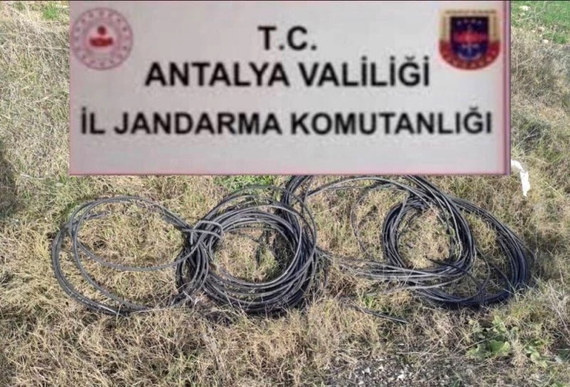 Antalya’nın Serik ilçesinde 300 metrelik haberleşme ve nakil kablosu ile dinamo çalan hırsızlar, jandarma tarafından yakalandı.