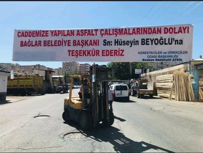 Diyarbakır’ın Bağlar Belediyesi’nin asfaltlama çalışması yaparak yıllar sonra kullanışlı yola kavuşturduğu Keresteciler ve Direkçiler bölgesi esnafı, yapılan hizmetten dolayı Belediye Başkanı Hüseyin Beyoğlu için teşekkür pankartı astı.
