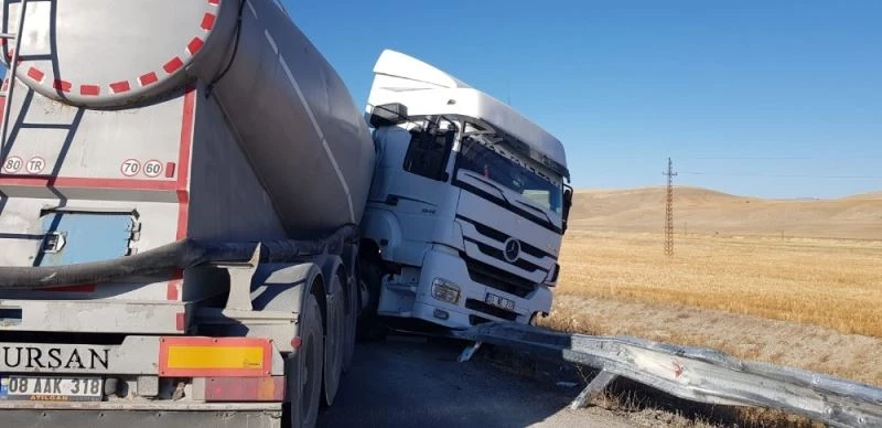 Erzurum’un Aşkale ilçesinde meydana gelen trafik kazasında sürücüsünün direksiyon hakimiyetini kaybettiği tır, yolun ortasında karşı şeride geçerek durabildi.