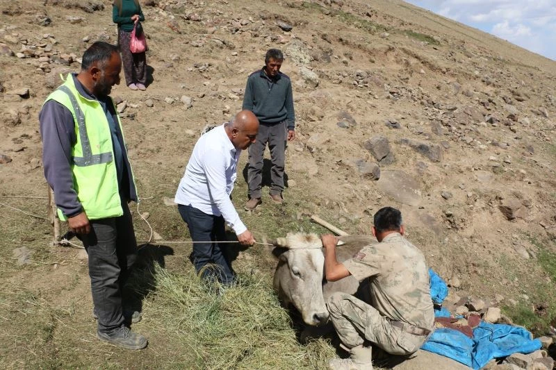 Diyadin’de uçurumdan yuvarlanan inek kurtarıldı