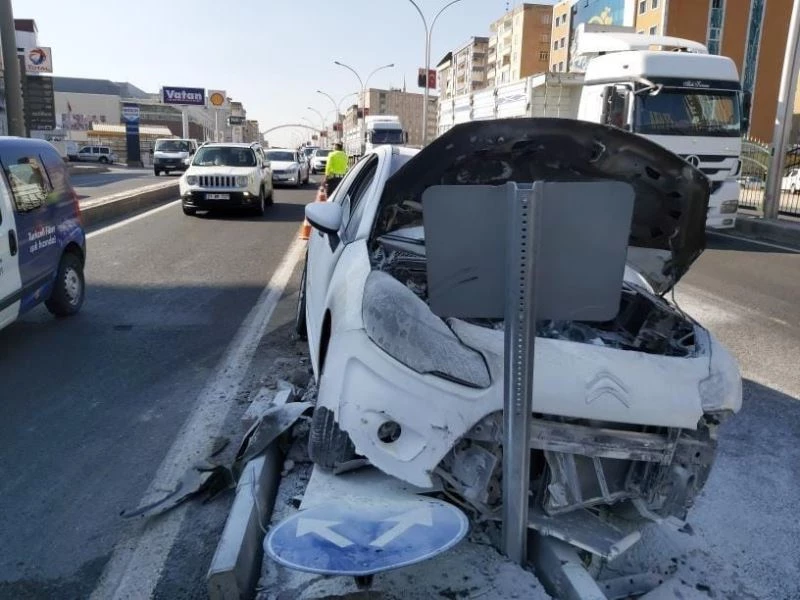 Diyarbakır’da refüje çıkıp trafik levhasına çarpan otomobil alev aldı: 2 yaralı