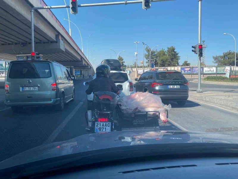 Olay, Diyarbakır’ın Yenişehir ilçesi Elazığ Caddesi üzerinde meydana geldi. 21 AAC 871 plakalı motosiklet sürücüsü, kasaya yüklediği ambalajsız et ile yolculuk yaptı. Kilometrelerce yol giden sürücünün, sağlıksız et taşıdığı anlar çevredekilerin cep telefonu kameralarına yansıdı. Saatlerce trafikte güneş altında yoluna devam eden şahıs, görenlerin tepkisine neden oldu. Şahsın kim olduğu ve bu etleri nereye taşıdığı ise merak konusu oldu.