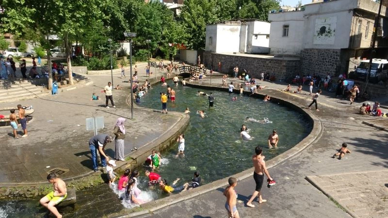 Diyarbakır’da sıcaktan bunalan çocuklar süs havuzlarını doldurdu