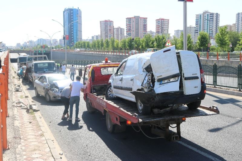 Olay, Diyarbakır-Şanlıurfa yolu üzeri Kadın Doğum ve Çocuk Hastanesi önü köprülü kavşakta meydana geldi. Edinilen bilgilere göre 34 HL 0507 plakalı otomobil sollama yaparken 21 DN 793 plakalı araca çarptı. Çarpmanın etkisiyle iki araç da savrulurken, arkadan gelen 47 AF 999 ve 21 BG 264 plakalı araçlar da kazaya karıştı. Olayda 2’si çocuk 7 kişi yaralandı.