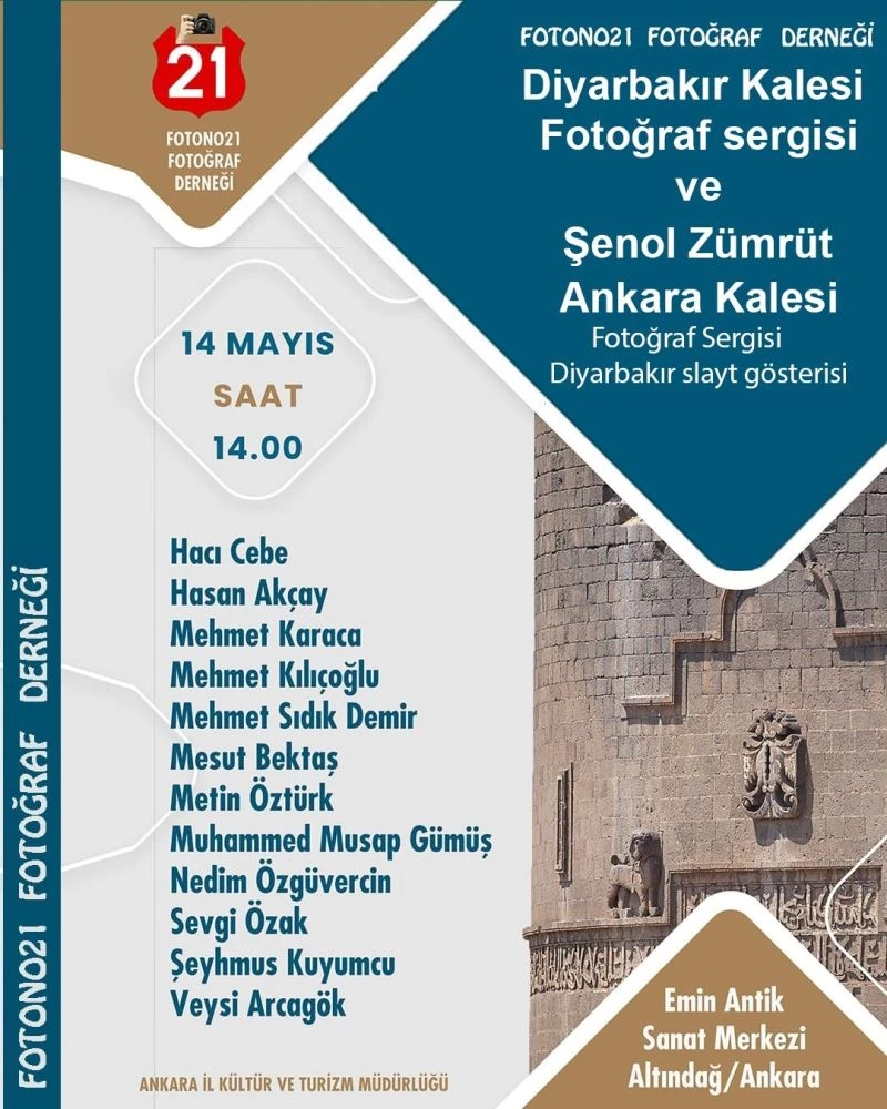 Türkiye Cumhuriyetinin kurucusu Mustafa Kemal Atatürk’ün fikir babam dediği Ziya Gökalp’in yetiştiği, kardeşlik şiiri ile derin mesajlar veren Cahit Sıtkı Tarancı’nın bu derin kadim Türk kültüründen beslendiği, Artuklu ve Akkoyunlu Başkenti Diyarbakır Fotono21 Fotoğraf Derneği Başkanı Mehmet Kılıçoğlu’nun başkanlığında fotoğraf sanatçılarının Diyarbakır fotoğrafları, Ankara’dan emekli albay uluslararası ödüllü fotoğraf sanatçısı Şenol Zümrüt’ün Diyarbakır’da görev yaptığı dönemden sur içi fotoğrafları yoğunluklu slayt gösterisi Ankara Kalesi fotoğrafları ile iki kadim şehrin birlikte bir yürek olarak kucaklaşacağı sergide son hazırlıklar tamamlandı. Ankara İl Kültür ve Turizm Müdürü Ali Ayvazoğlu’nun desteklediği fotoğraf sergisinin 14 Mayıs saat 14.00’de Ankara Kalesi Emin Antik Sanat Merkezinde sergileneceği belirtildi.