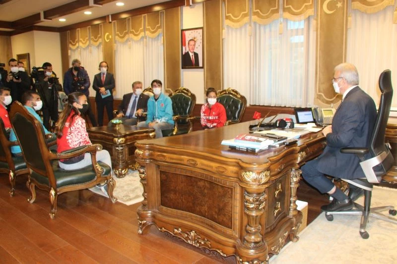 Vali Karaloğlu, makamında ağırladığı sporculara çeşitli hediyeler verdi.