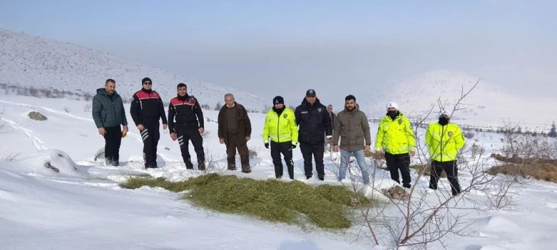 Kahramanmaraş’ın Elbistan ilçesinde Doğa Koruma ve Milli Parklar (DKMP) Şefliği ve İlçe Emniyet Müdürlüğü personelleri bir metreden fazla kar örtüsünün kapladığı bölgede yaşayan yaban hayvanları için yem bıraktı.